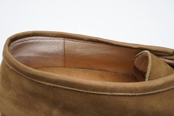 表情のある素材感や、柔らかな手触りが特徴のコットンシューレースを使用しました。 ヌバックレザーとも相性が良く、素朴さが魅力です。