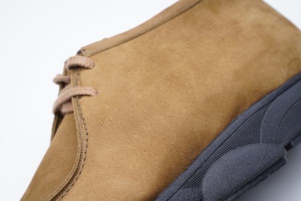 ヌバックレザーは、銀面(スムース面)を細かく起毛させて作られています。スエードよりも滑らかで繊細な起毛感が特徴です。 WALLABYに採用したヌバックは、中でも繊維層が密でコシのある国産のものを使用しております。