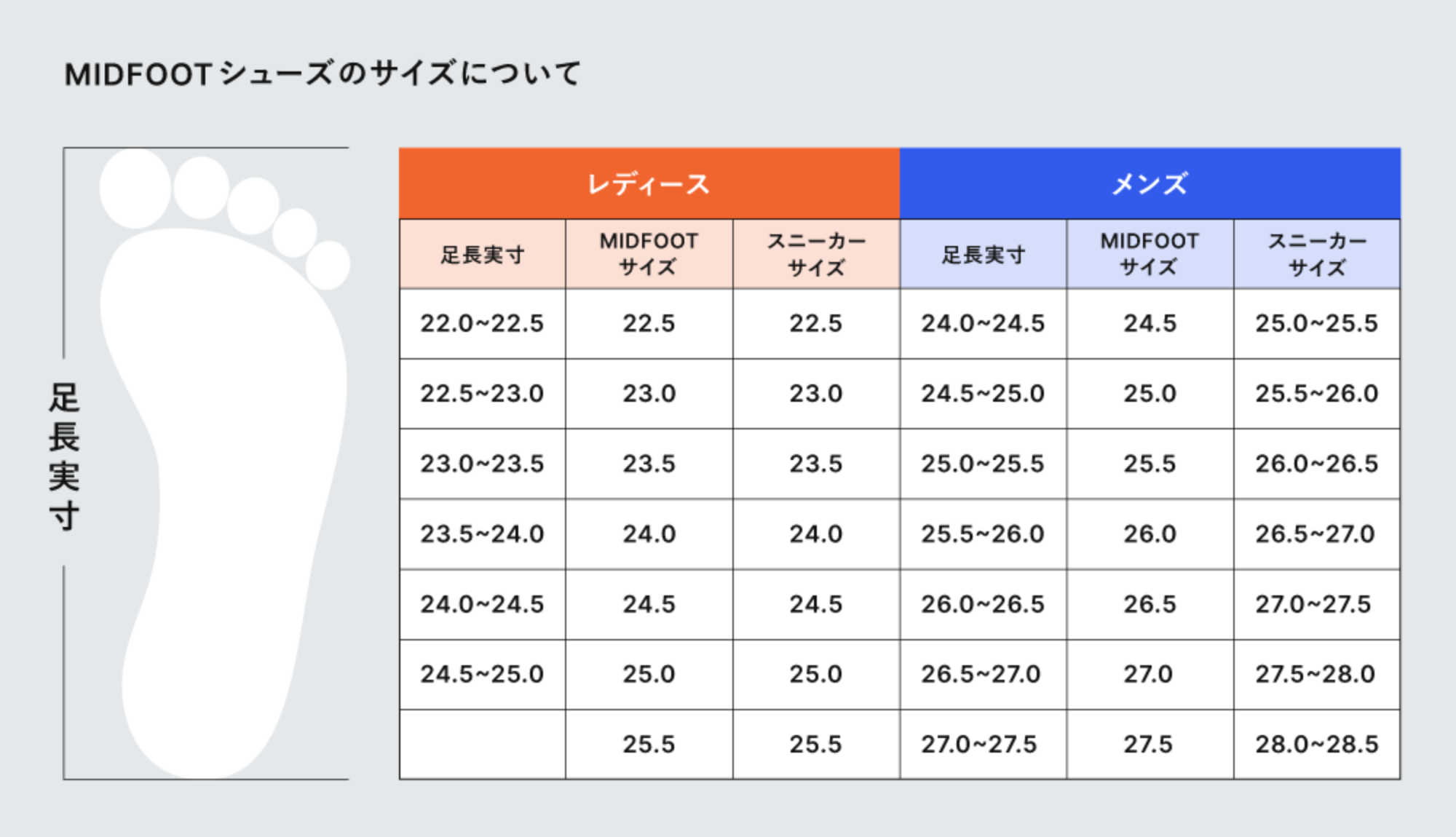 男性の方は、通常のスニーカーサイズより 0.5~1.0cm 小さいサイズをお選びください。例えば普段履いているスニーカーが 28.0cm だった場合、ミッドフットは 27.0cm で合う可能性が高いです。