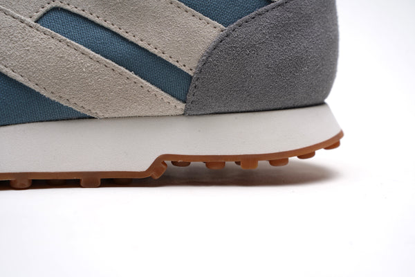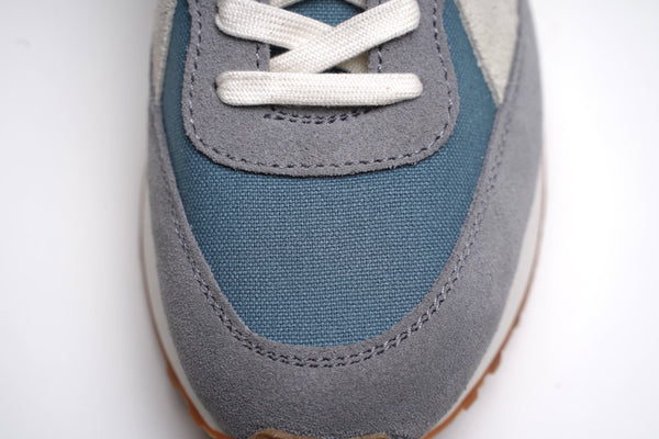 プロテクトパーツやロゴパーツには、国産の牛革スエードを使用しています。つま先や踵など擦れやすい部分や紐のテンションがかかる羽根部分に肉厚で丈夫な革を用いています。またキャンバス生地と相性がよく、風合いが活きます。