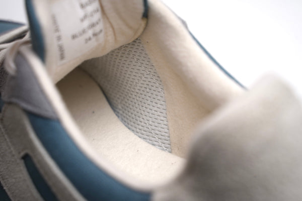 アッパーのボディには、富士金梅という国産のキャンバス生地を使用。コットン100%で風合いもありながら、目の詰まった生地目なのですっきりとした印象に仕上がります。