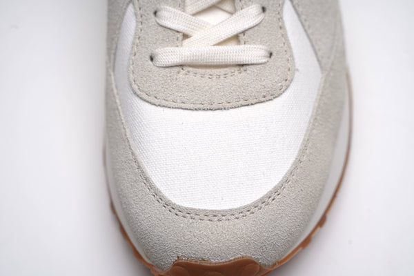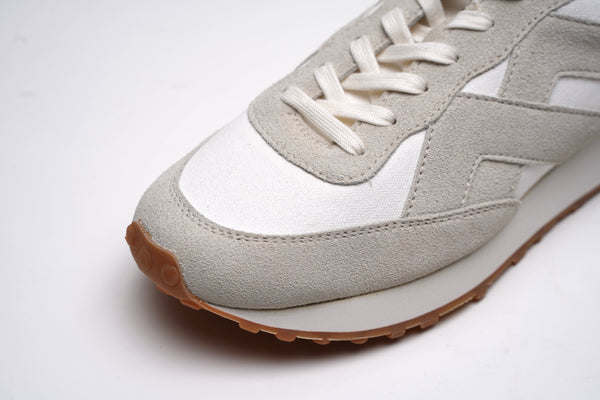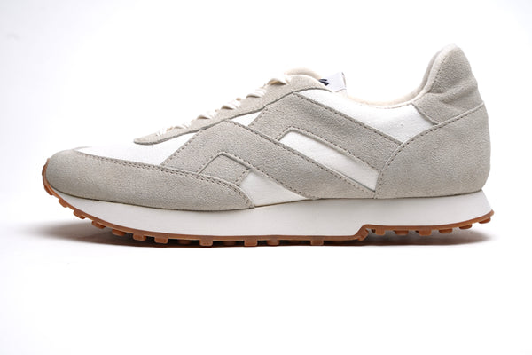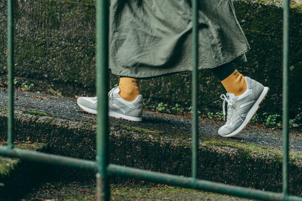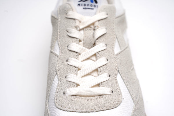 ボディには国産のキャンバス生地を使用、太めにあしらったMFマークやつま先、踵など補強パーツには牛革スエードを使っております。シンプルなデザインで、綺麗めのファッションにも相性がよくなっております。ソールは従来のミッドフットソールとは違い、削り出し式のローテクソールを採用、クセの少ない履き心地になっております。ライトめのミッドフットシステムなので標準的なスニーカーの履き心地に近いです。