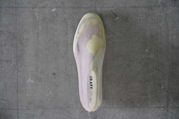 従来のミッドフットソールは、ゴムなどの原材料を金型で加熱して成形する作り方です。形状やデザインを底面や側面など自由に作ることができるので近代的な手法です。 一方、削り出し式はシート状のゴムやEVA等の材料から裁断・貼り合せ・削りの加工をして形状を作ります。昔ながらの作り方で手間はかかりますが、古めかしい独特の仕上がりになります。