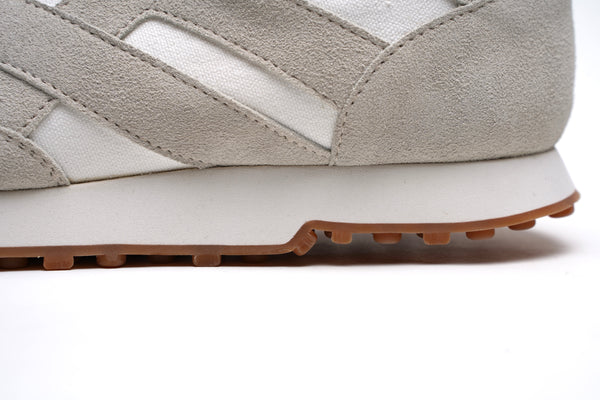 プロテクトパーツやロゴパーツには、国産の牛革スエードを使用しています。つま先や踵など擦れやすい部分や紐のテンションがかかる羽根部分に肉厚で丈夫な革を用いています。またキャンバス生地と相性がよく、風合いが活きます。